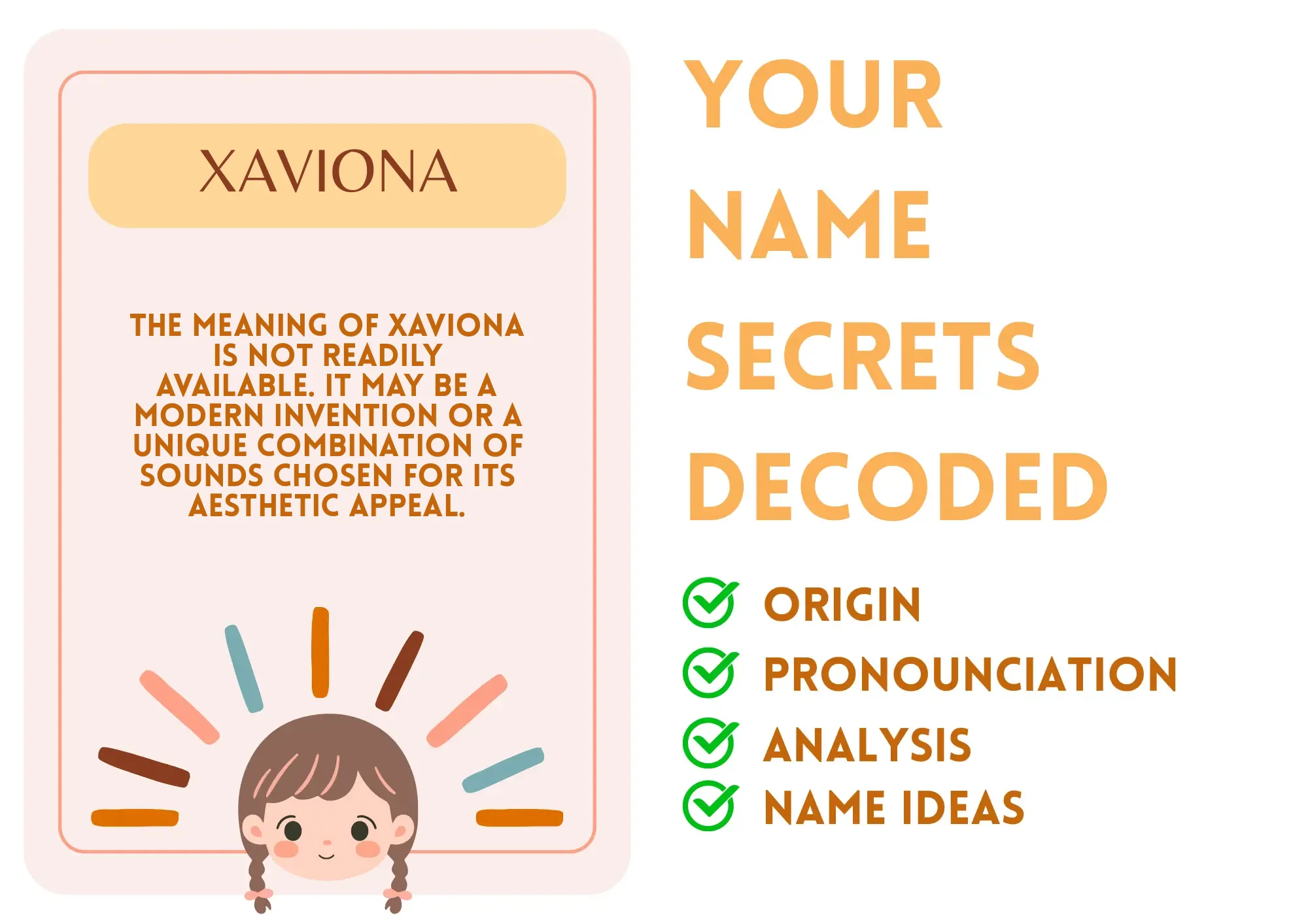 Meaning: The meaning of Xaviona is not readily available. It may be a modern invention or a unique combination of sounds chosen for its aesthetic appeal.