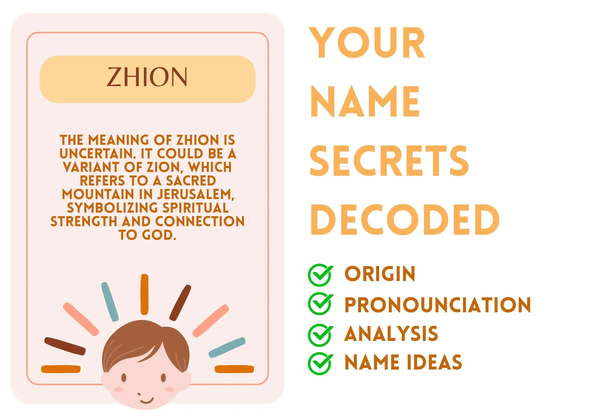 Zhion is a unique and uncommon name with a strong, modern feel. Its origin is unclear, but it could be a variant of Zion, a name with religious significance in Judaism and Christianity, referencing a sacred mountain in Jerusalem. The name Zhion carries a sense of strength, spirituality, and resilience, making it a powerful choice for parents seeking a distinctive and meaningful name.