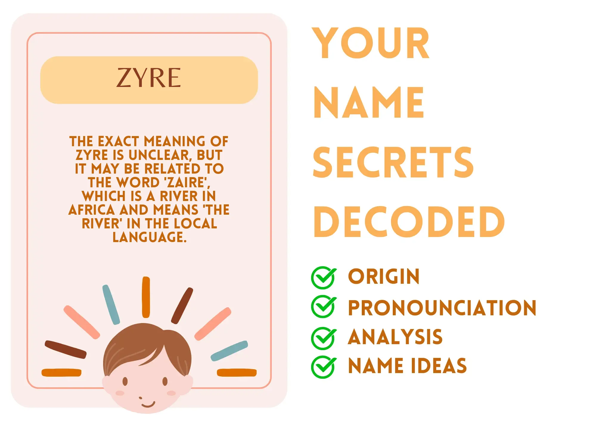 Origin: The origin of the name Zyre is unclear, but it is likely a variation of 'Zaire', which is a river in Africa. Some sources also suggest it could be of English origin.
