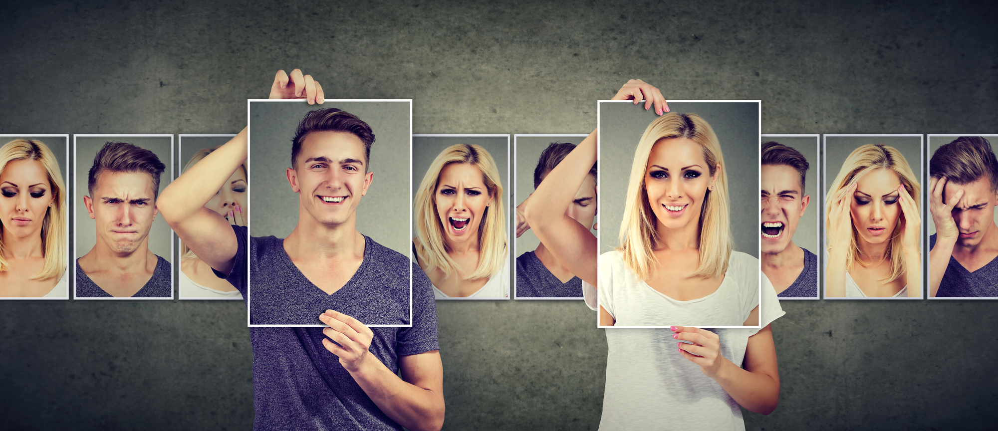 Balanced relationship concept. Masked woman and man expressing different emotions