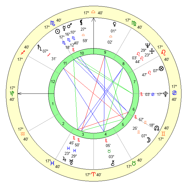 | Venus | 1 Libra 3 | 4 Scorpio 43 | 22 Capricorn 42 |