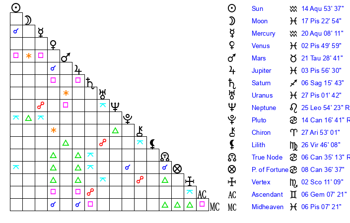 | Sun | 14 Aquarius 54 | 16 Aquarius 8 | 21 Taurus 56 |