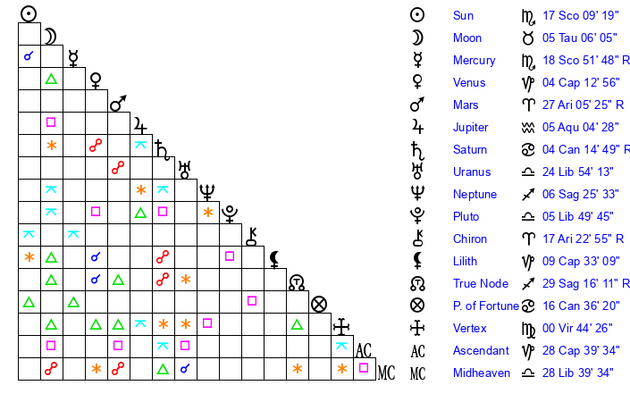 | Sun | 17 Scorpio 9 | 17 Scorpio 33 | 9 Capricorn 53 |