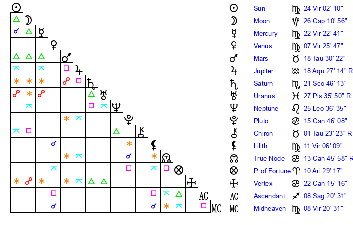 | Sun | 24 Virgo 2 | 25 Virgo 3 | 3 Capricorn 10 |