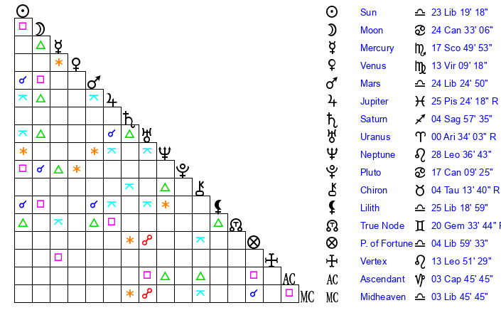 | Moon | 24 Cancer 32 | 11 Virgo 53 | 13 Aquarius 11 |