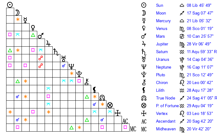 | Sun | 8 Libra 45 | 8 Libra 46 | 11 Scorpio 31 |