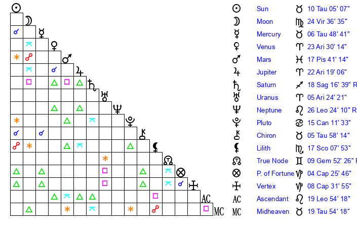 | Sun | 10 Taurus 5 | 10 Taurus 36 | 12 Leo 59 |