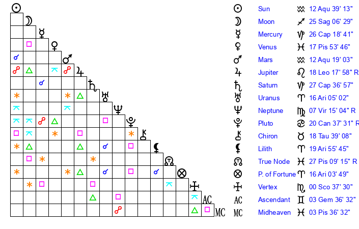 | Mercury | 26 Capricorn 19 | 9 Aquarius 15 | 18 Aries 54 |