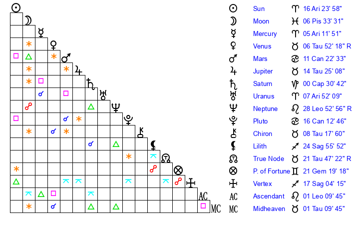 | Neptune | 28 Leo 53 | 0 Aries 16 | 29 Leo 36 |