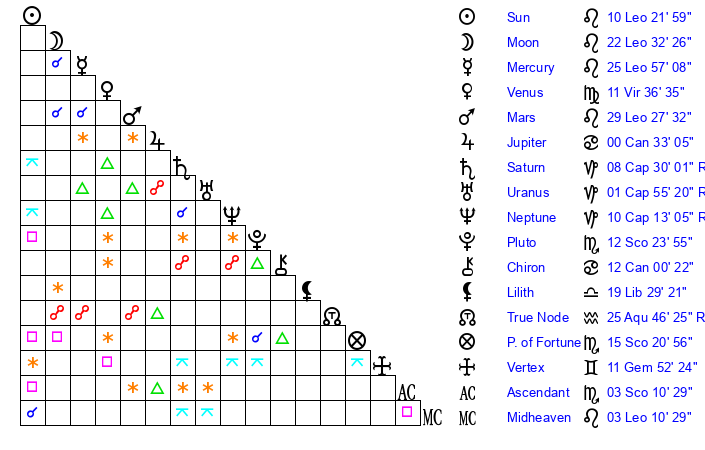 | Moon | 22 Leo 25 | 23 Scorpio 31 | 7 Sagittarius 6 |