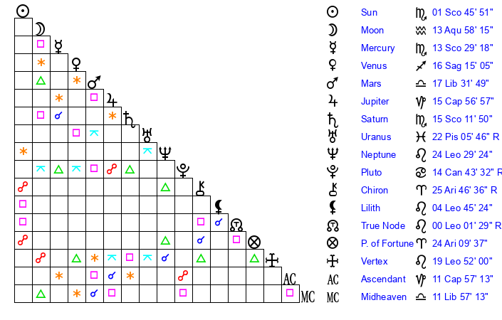 | Moon | 13 Aquarius 57 | 18 Sagittarius 11 | 5 Libra 24 |