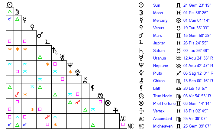 | Sun | 24 Gemini 23 | 24 Gemini 50 | 20 Cancer 8 |