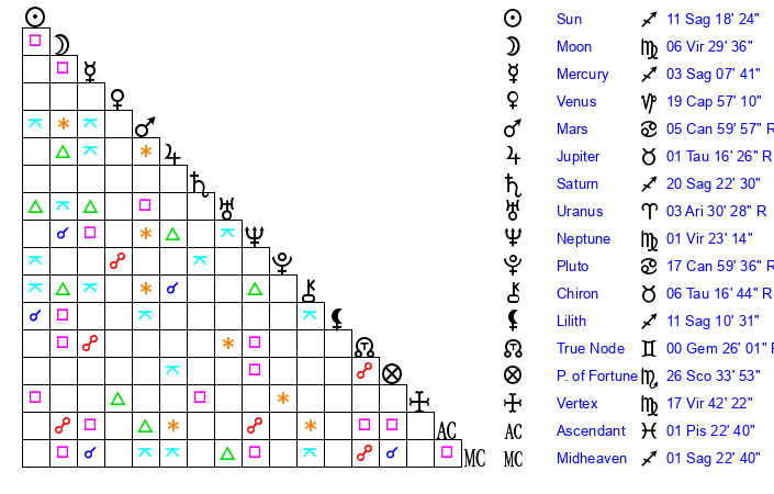 | Sun | 11 Sagittarius 19 | 11 Sagittarius 47 | 19 Pisces 39 |