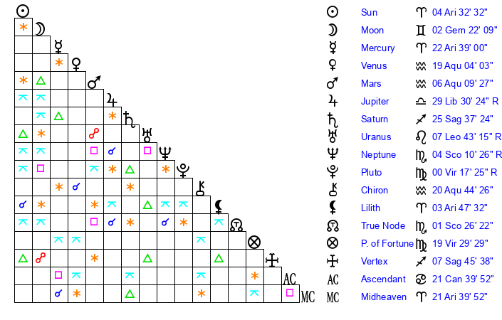 | Sun | 4 Aries 32 | 5 Aries 18 | 9 Gemini 43 |