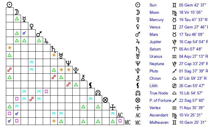 | Sun | 5 Gemini 42 | 5 Gemini 42 | 3 Cancer 26 |