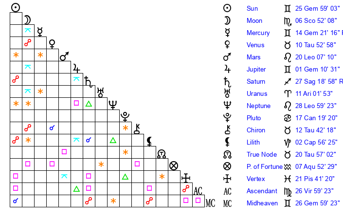 | Sun | 25 Gemini 59 | 26 Gemini 45 | 28 Virgo 13 |