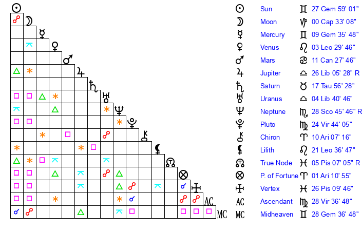 | Sun | 27 Gemini 59 | 28 Gemini 40 | 20 Leo 31 |