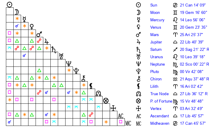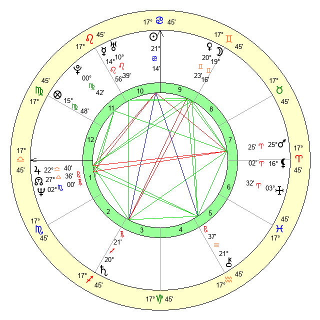 Sun | 21 Cancer 14 | 22 Cancer 0 | 25 Virgo 44 |