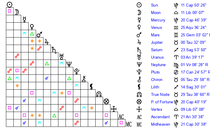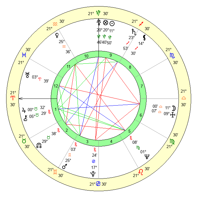 | Moon | 11 Libra 2 | 2 Cancer 30 | 17 Aries 24 |