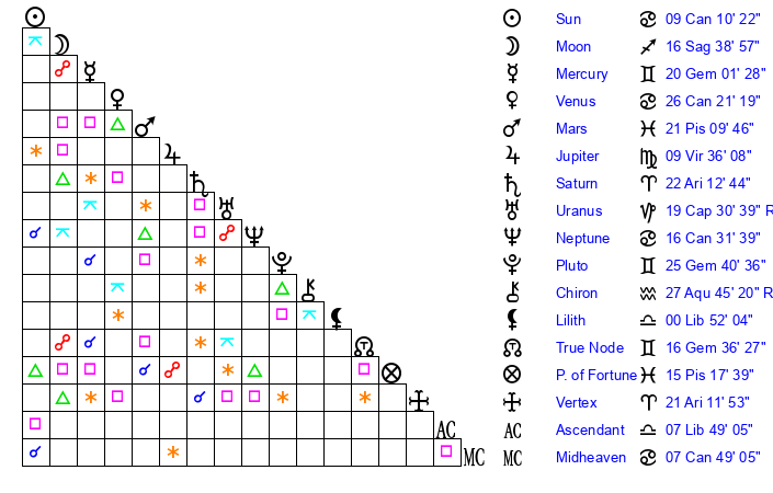 | Neptune | 16 Cancer 32 | 2 Aries 10 | 19 Cancer 21 |
