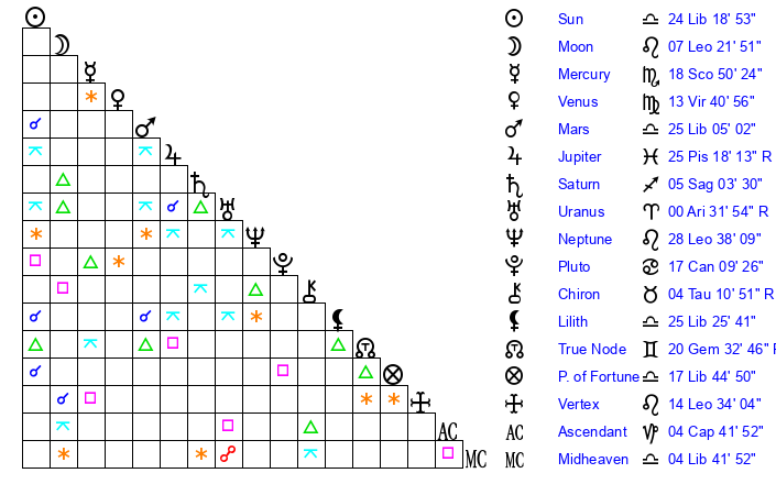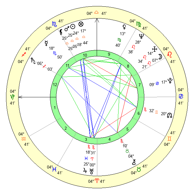 | Sun | 24 Libra 19 | 25 Libra 34 | 3 Aquarius 29 |