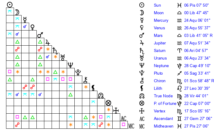 | Saturn | 5 Aries 54 | 20 Pisces 6 | 9 Aries 18 |