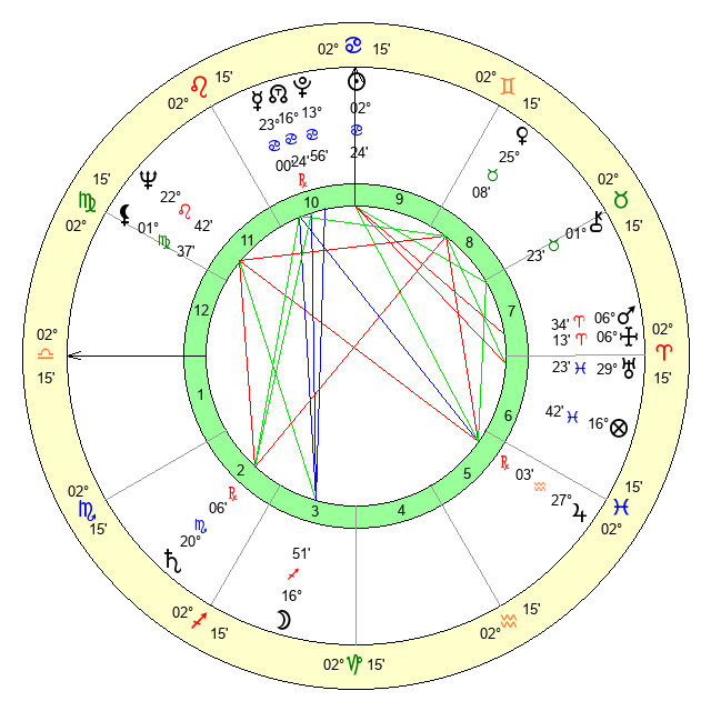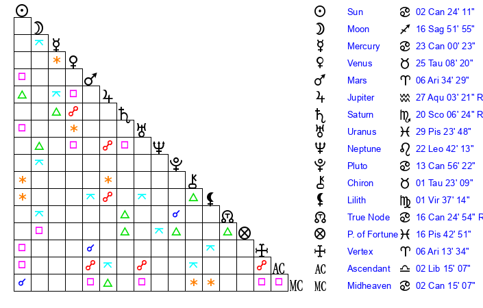 | Sun | 2 Cancer 24 | 3 Cancer 26 | 7 Libra 45 |