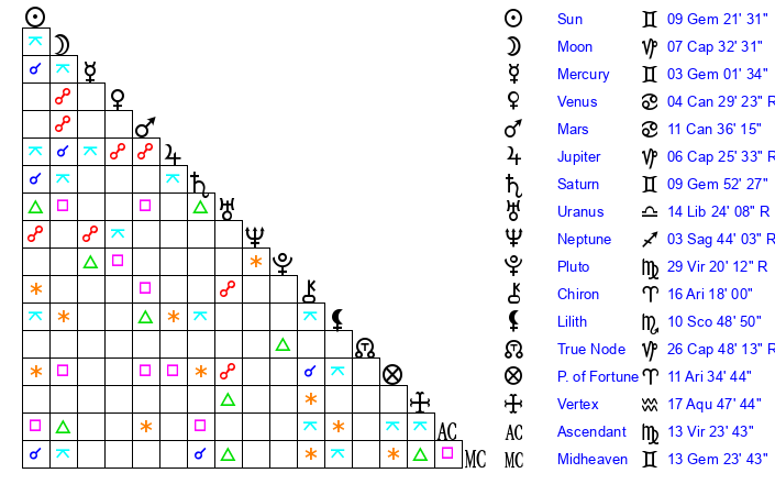 | Saturn | 10 Gemini 7 | 0 Aries 18 | 16 Gemini 36 |