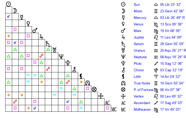 | Venus | 13 Scorpio 0 | 11 Virgo 15 | 13 Scorpio 13 |
