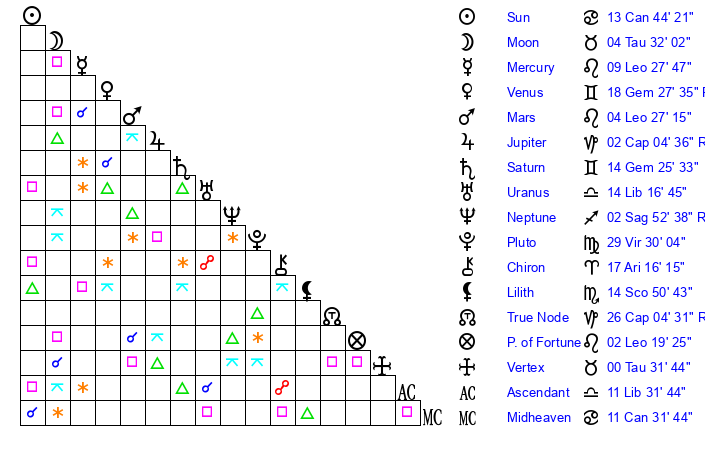 | Moon | 4 Taurus 27 | 15 Scorpio 30 | 13 Aries 13 |