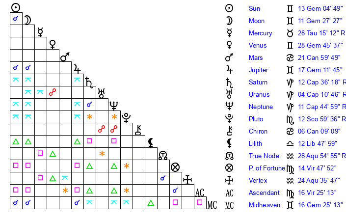 | Pluto | 12 Scorpio 59 | 3 Aquarius 36 | 12 Scorpio 24 |