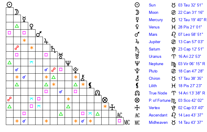 | Sun | 3 Taurus 33 | 4 Taurus 46 | 3 Leo 41 |