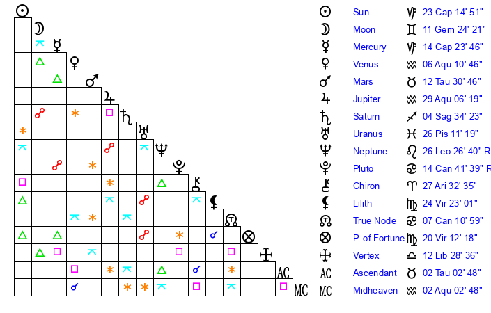 | Jupiter | 29 Aquarius 3 | 12 Gemini 0 | 21 Pisces 52 |