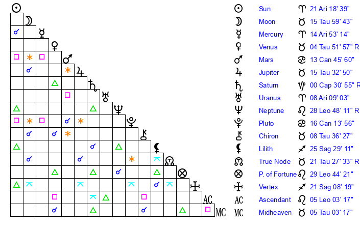 | Moon | 16 Taurus 0 | 7 Libra 43 | 28 Scorpio 4 |