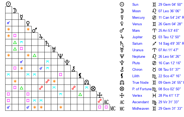 | Sun | 29 Gemini 5 | 29 Gemini 37 | 2 Libra 22 |