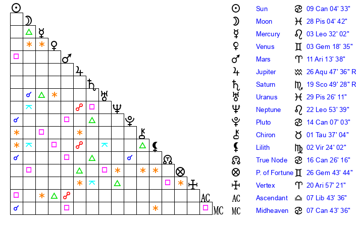 | Moon | 28 Pisces 4 | 27 Virgo 56 | 4 Scorpio 44 |