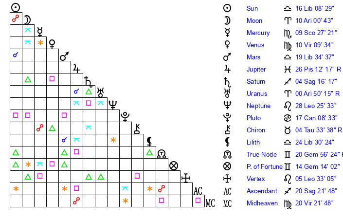 | Moon | 9 Aries 55 | 3 Gemini 21 | 12 Scorpio 4 |