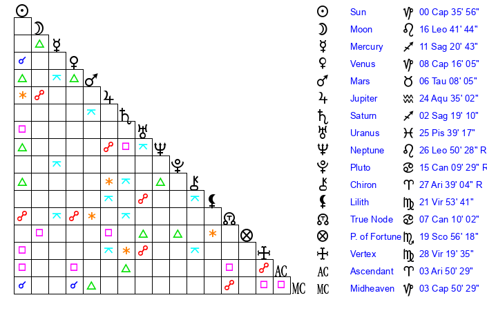 | Sun | 0 Capricorn 36 | 1 Capricorn 36 | 10 Aries 28 |
