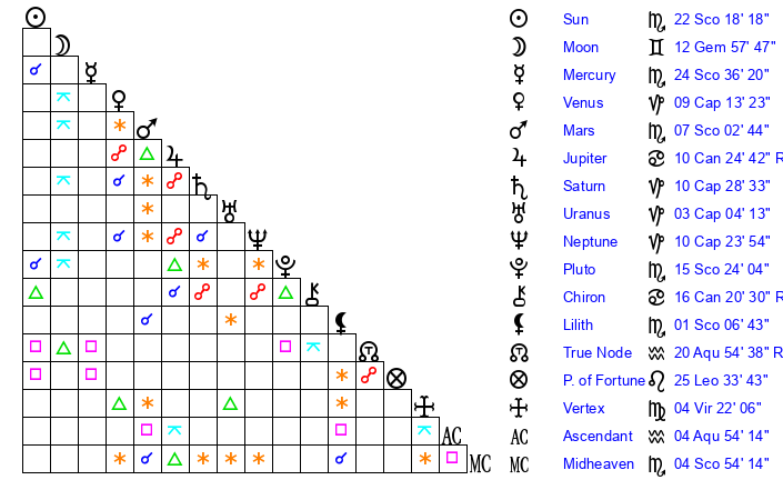 | Sun | 22 Scorpio 18 | 22 Scorpio 34 | 28 Sagittarius 48 |