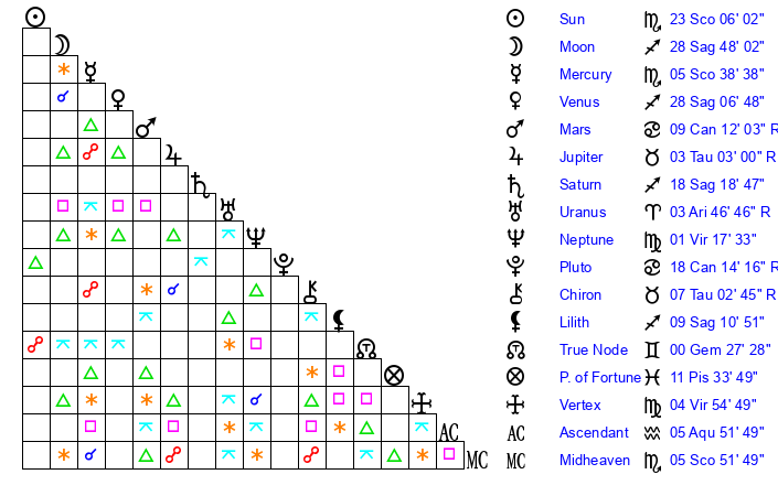 | Sun | 23 Scorpio 6 | 23 Scorpio 35 | 1 Pisces 36 |