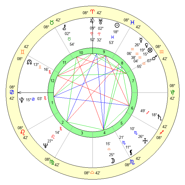 | Moon | 25 Libra 12 | 26 Cancer 47 | 9 Taurus 18 |