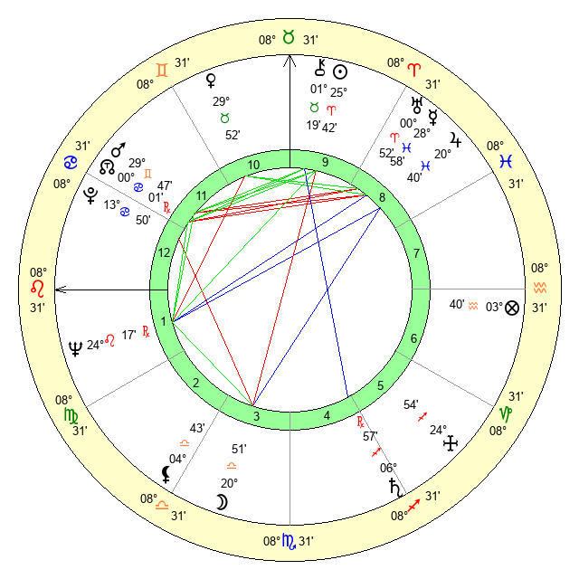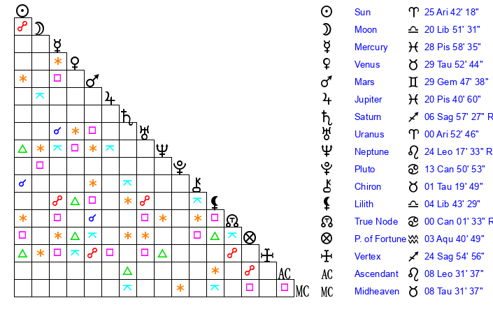 | Neptune | 24 Leo 17 | 0 Aries 37 | 25 Leo 43 |