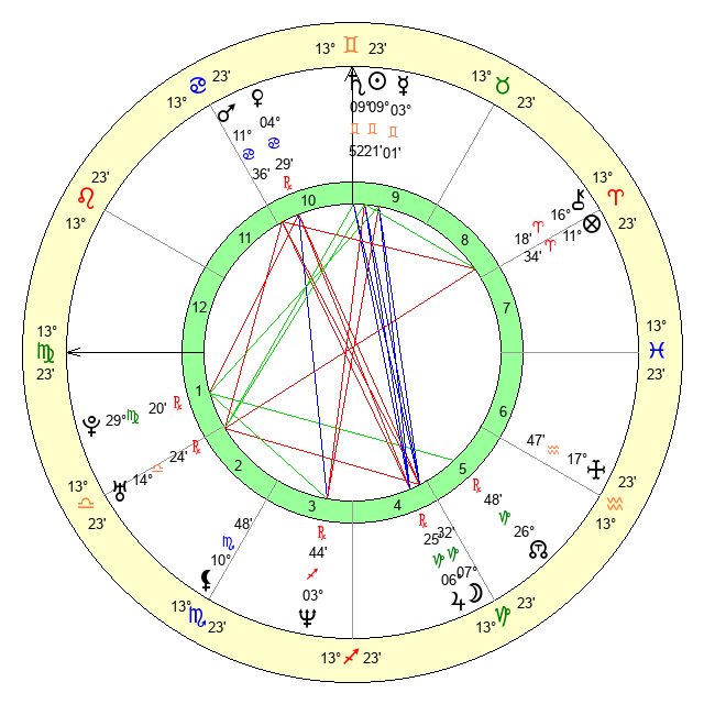 | Sun | 9 Gemini 21 | 9 Gemini 32 | 29 Cancer 57 |