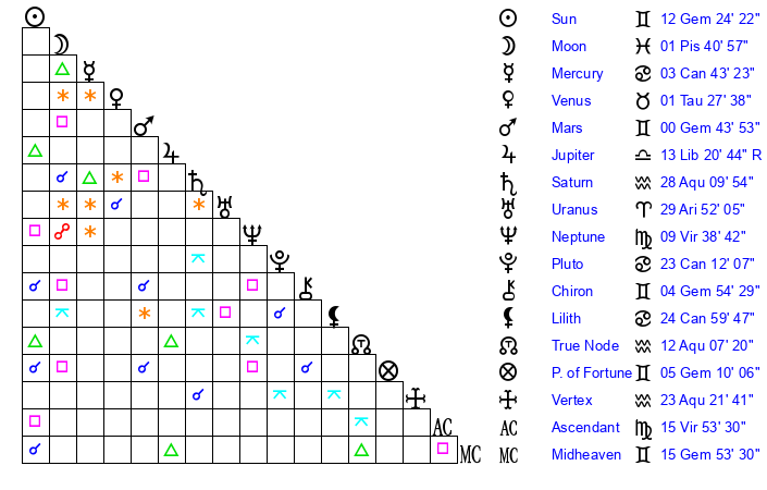 | Sun | 12 Gemini 24 | 13 Gemini 22 | 9 Virgo 31 |
