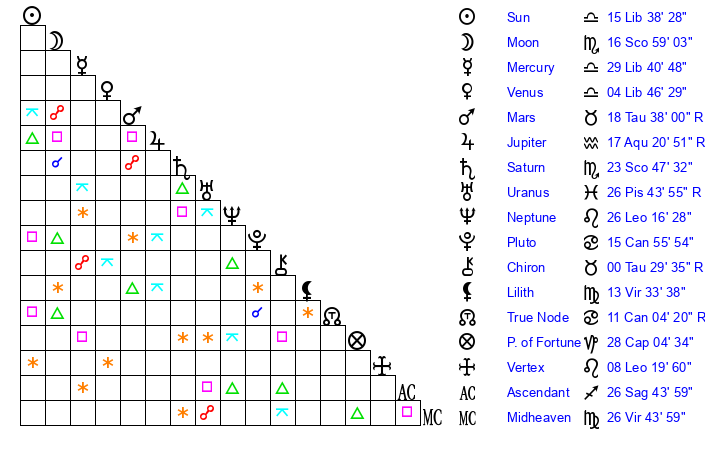 | Sun | 15 Libra 38 | 16 Libra 39 | 25 Capricorn 35 |