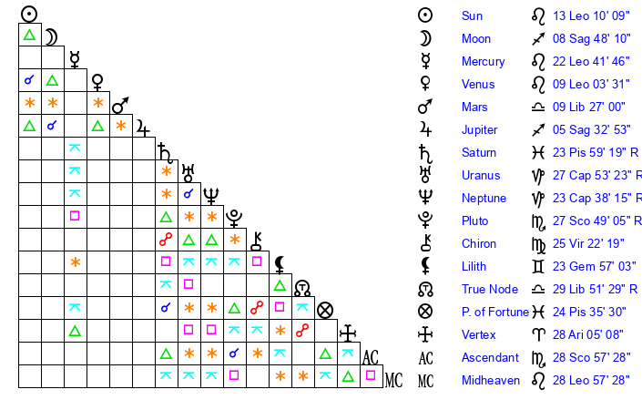 Sun | 13 Leo 10 | 13 Leo 53 | 12 Virgo 3 |