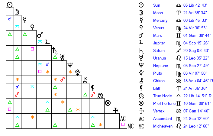 Moon | 21 Aries 39 | 29 Sagittarius 32 | 29 Virgo 45 |