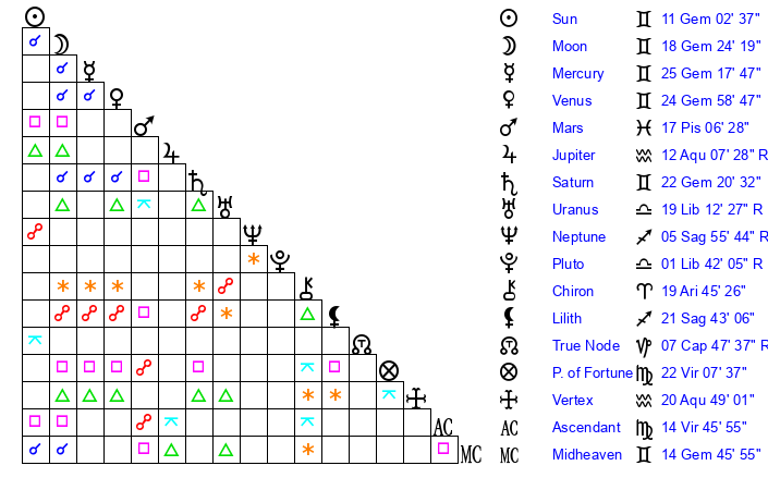 | Sun | 11 Gemini 2 | 11 Gemini 27 | 0 Leo 40 |