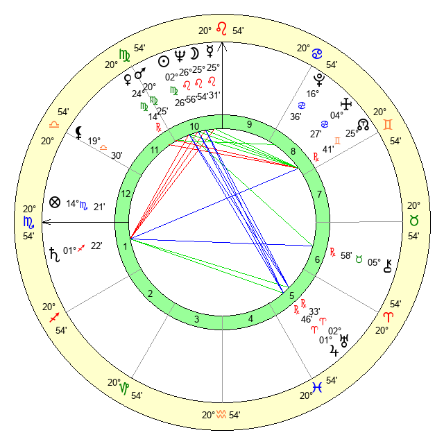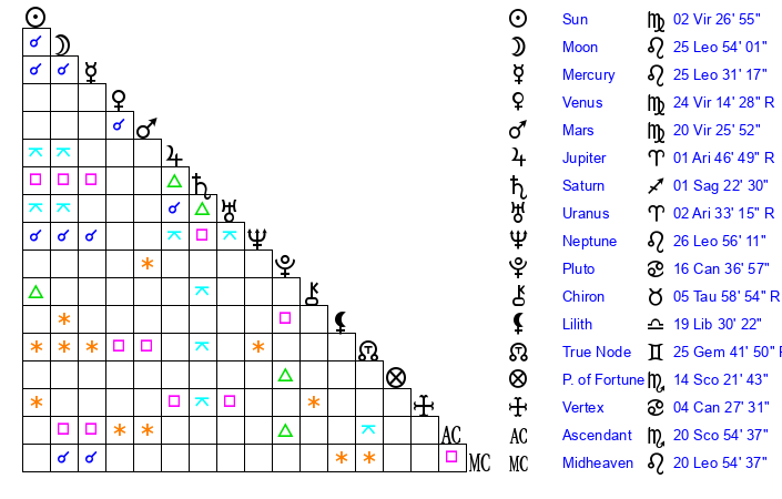 | Moon | 25 Leo 47 | 13 Libra 44 | 17 Pisces 29 |