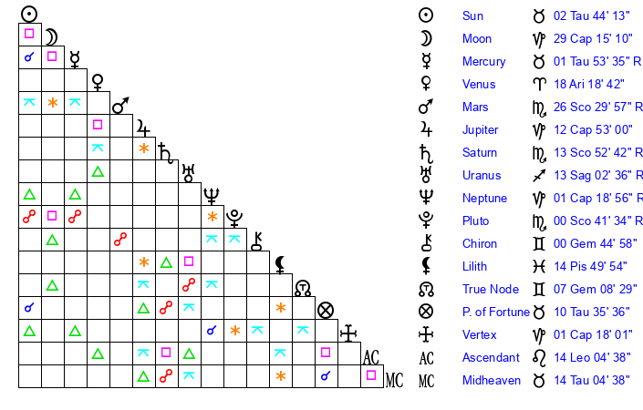 | Uranus | 13 Sagittarius 4 | 25 Taurus 52 | 11 Sagittarius 34 |